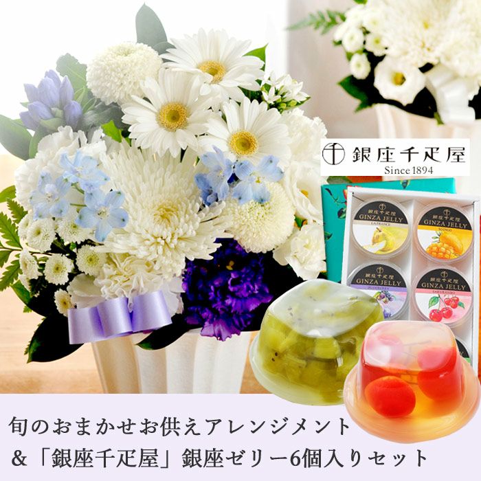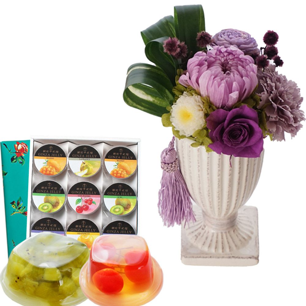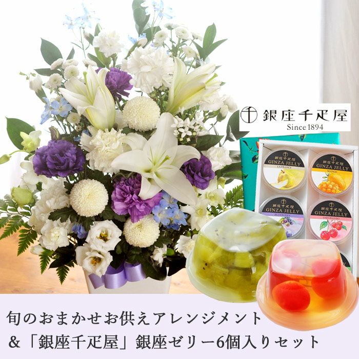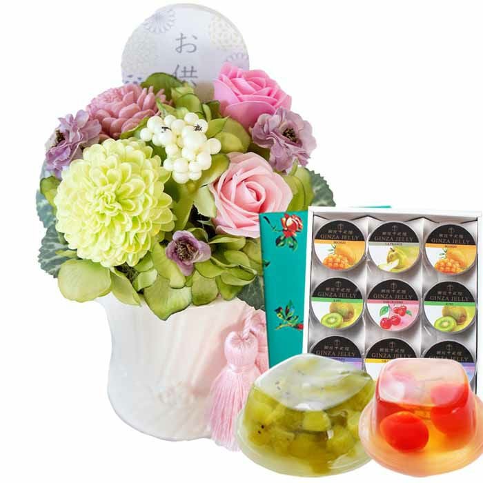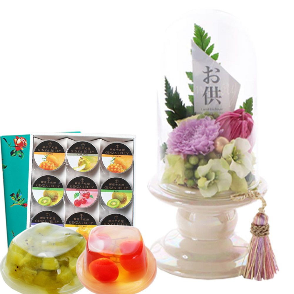 花とスイーツのセット ムーンダストを使ったお供えアレンジメントLサイズ+【銀座千疋屋】銀座フルーツゼリー6個入りセット 生花 FKAASW