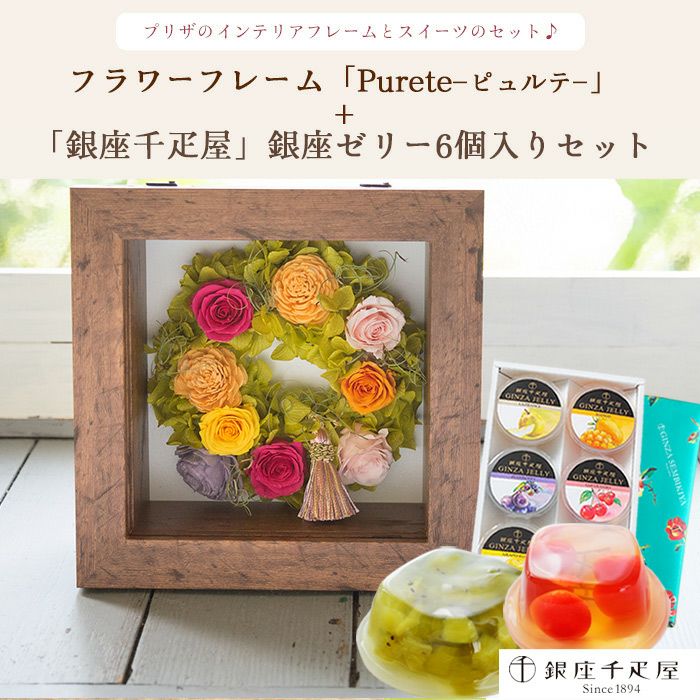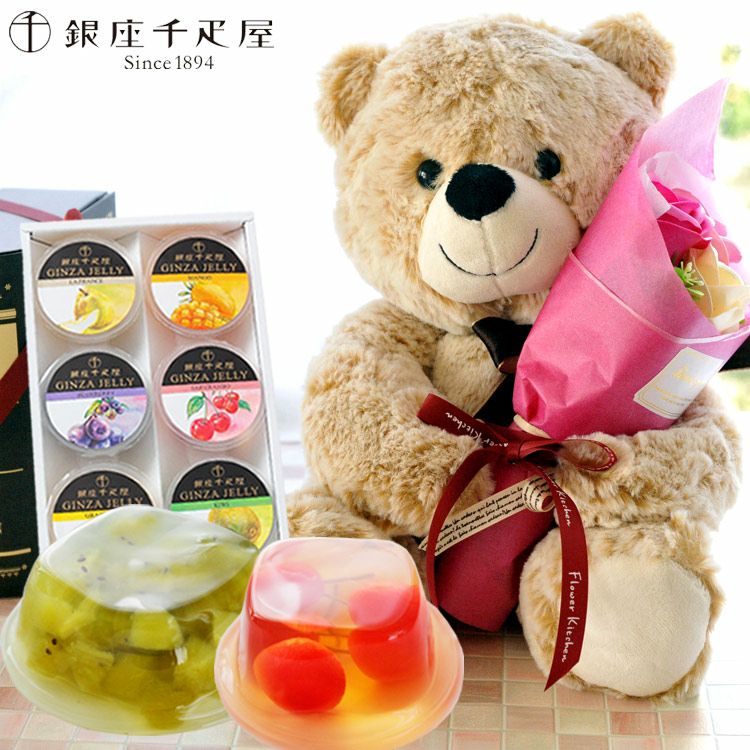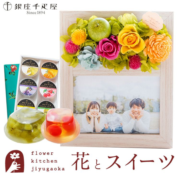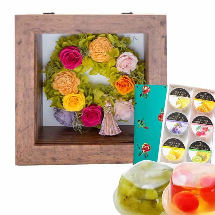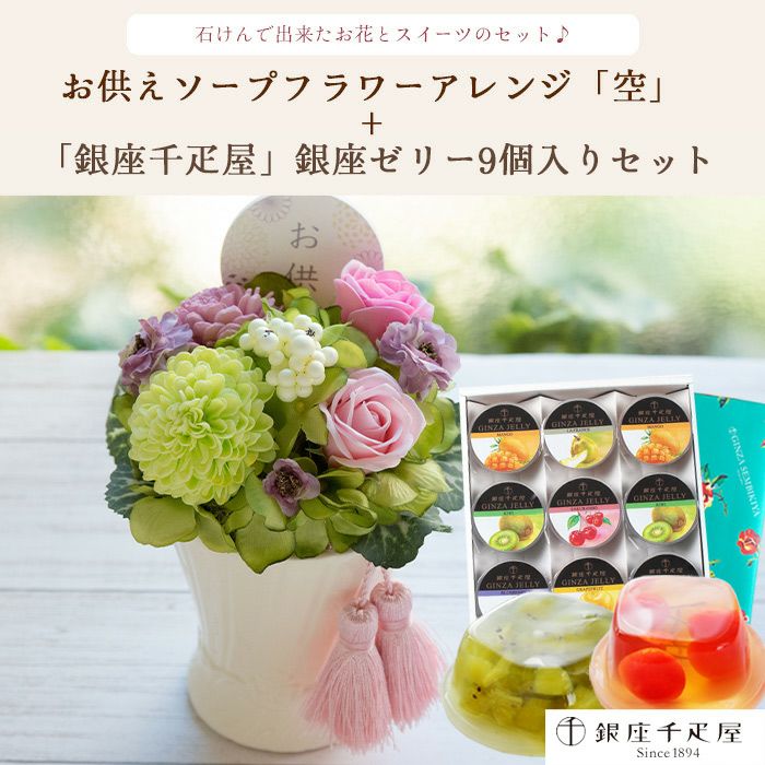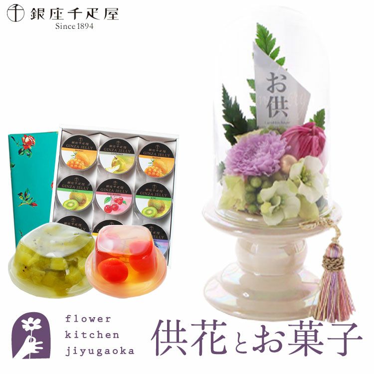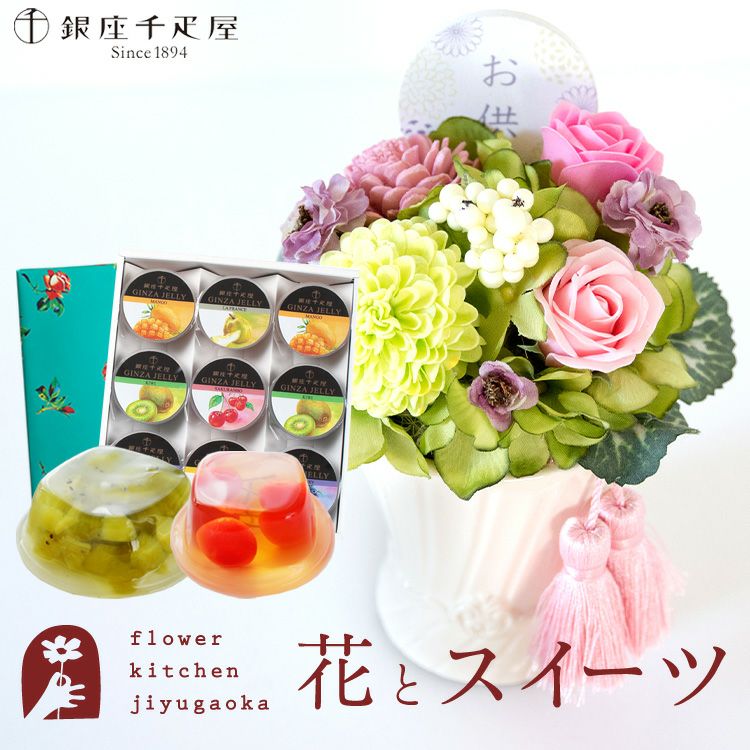 花とスイーツのセット ムーンダストを使ったお供えアレンジメントLサイズ+【銀座千疋屋】銀座フルーツゼリー6個入りセット 生花 FKAASW