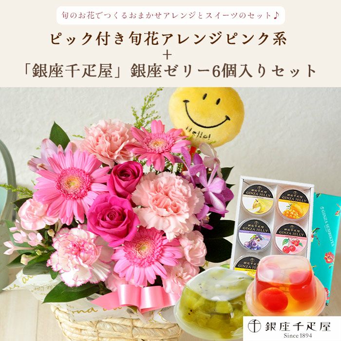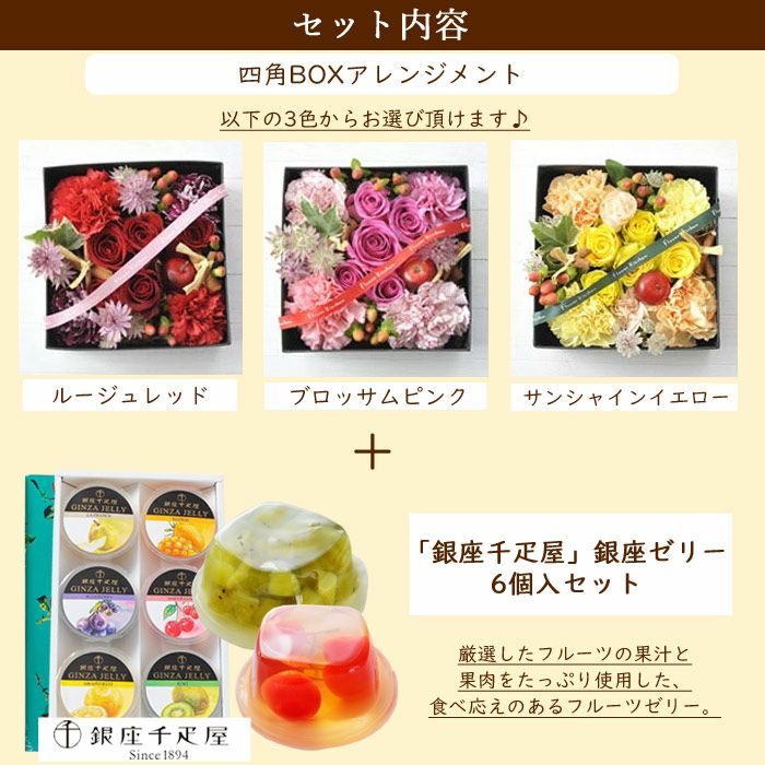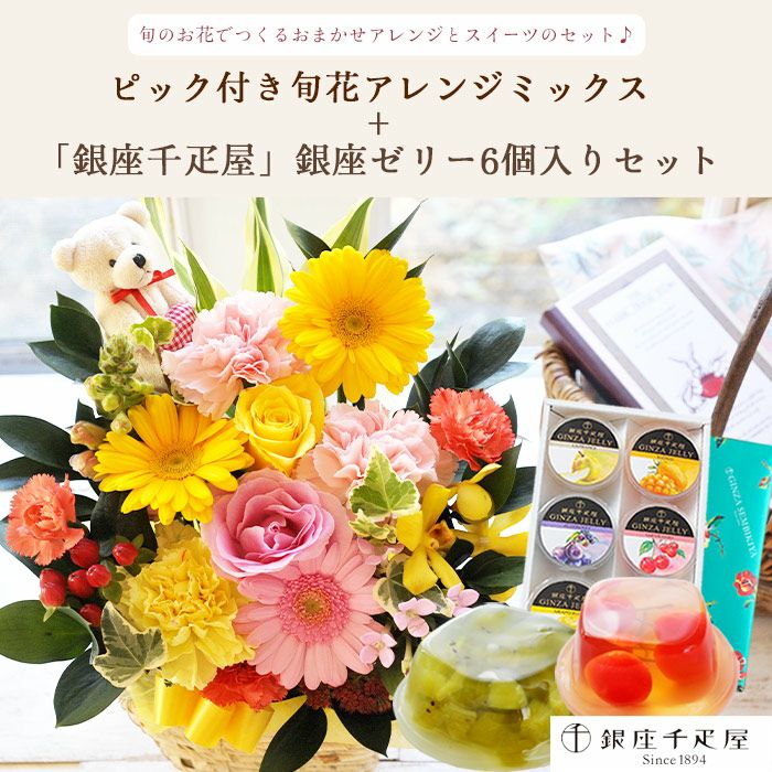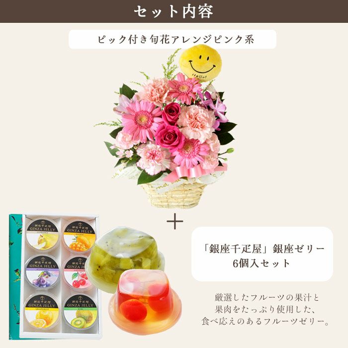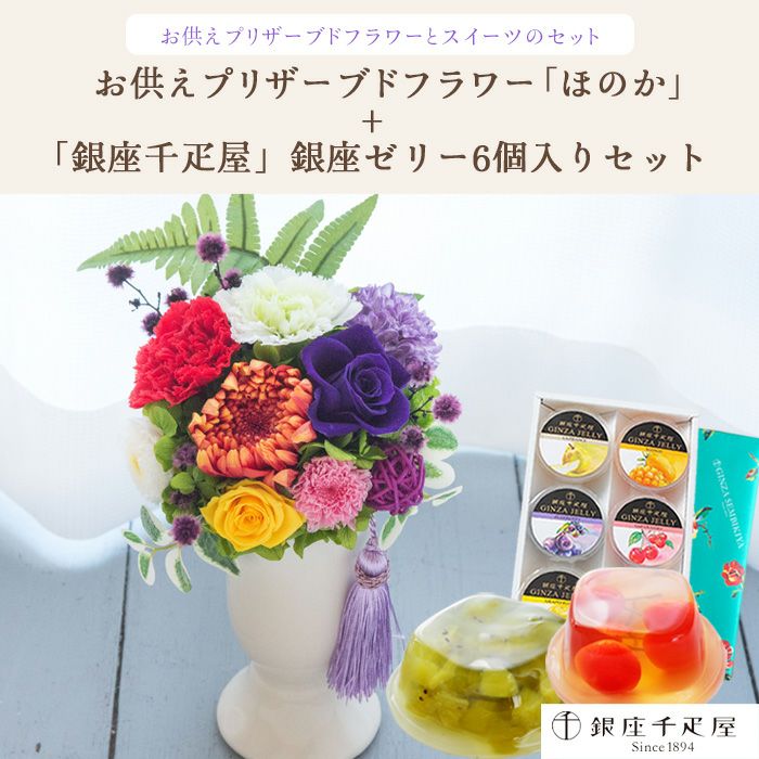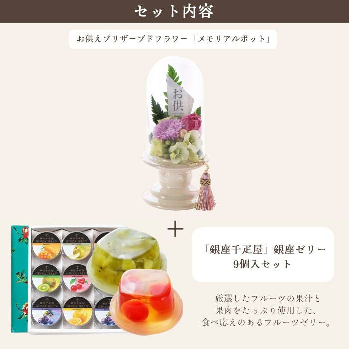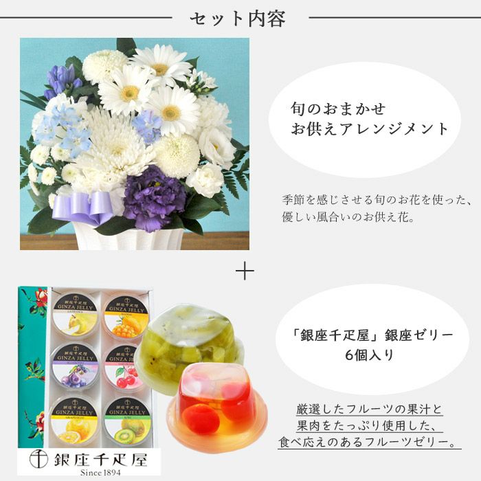 花とスイーツのセット ムーンダストを使ったお供えアレンジメントMサイズ+【銀座千疋屋】銀座フルーツゼリー6個入りセット 生花 FKAASW